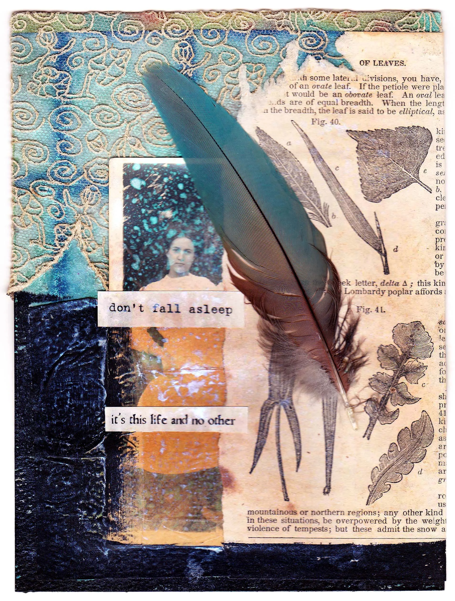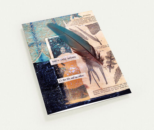 Mixed-media collage with a vintage herbarium pressed rose, hand-marbled paper, vintage paper ephemera, handmade paper, ink.